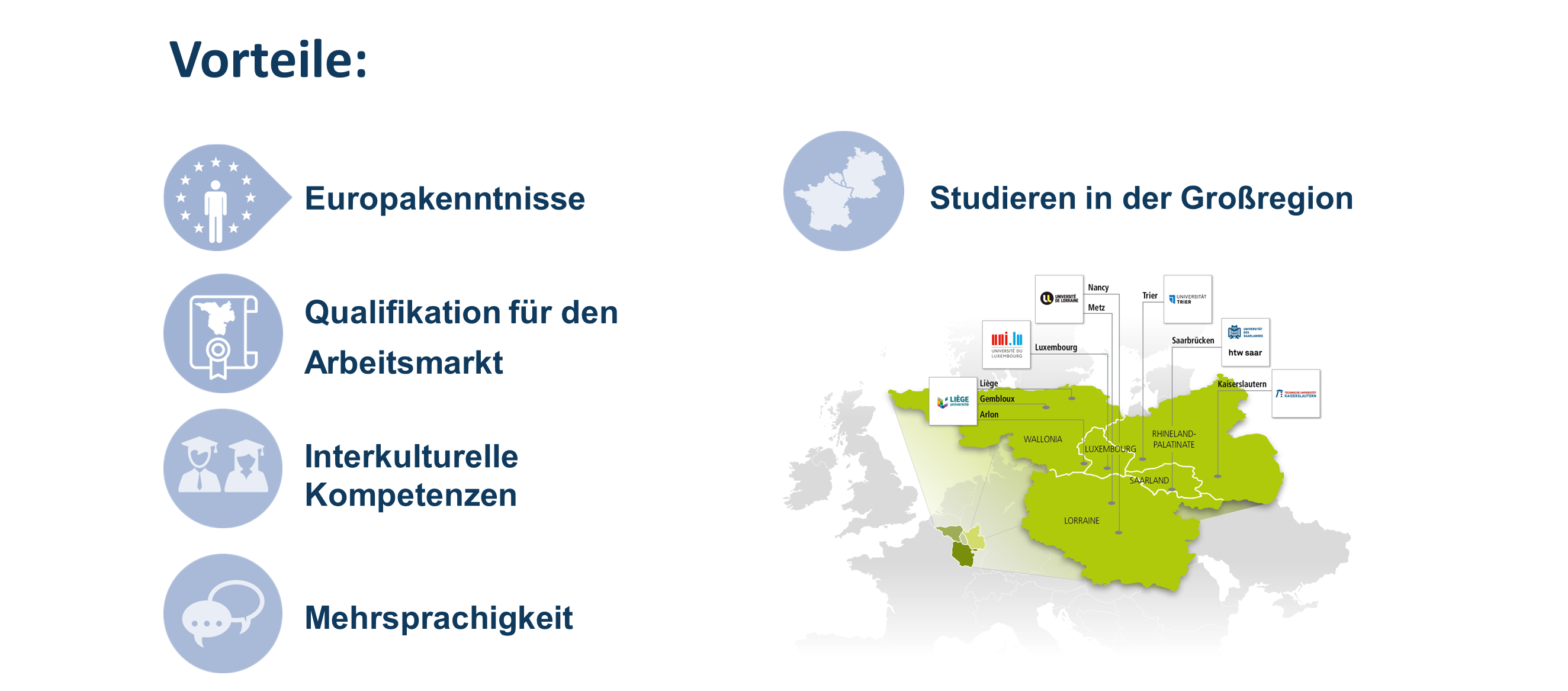 Das Modul besteht aus zwölf Einheiten zu Themen über Europa und die EU, die von Experten aus den sieben Partnerhochschulen der UniGR gestaltet werden. Das Modul besteht aus Videomaterial in Kombination mit eigenständiger Lektüre und schließt mit einem Multiple-Choice-Examen an der htw saar ab.
