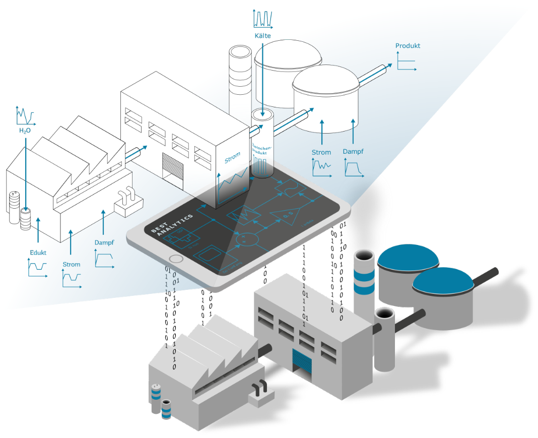 Im Projekt BEST-Analytics soll ein Modell zur Erstellung eines digitalen Zwillings industrieller Prozesse entwickelt werden. Dieser soll es zukünftig Unternehmen ermöglichen, Prognosen ihrer Energie- und Stoffströme zu erstellen, um so die Basis für eine Optimierung des Energiemanagements zu schaffen. Hierzu wird anhand einer Datenanalyse jedes einzelne Aggregat, bzw. jede einzelne Prozesseinheit mit ihrem Betriebsverhalten modelliert und in die Simulationsumgebung eingebunden. Hierbei werden evtl. vorhandene Schnittstellen zu anderen Prozesseinheiten berücksichtigt. Durch Vorgabe der äußeren Parameter, wie beispielsweise die Außentemperatur oder den Produktionsplan, können dann die Energie- und Stoffströme der entsprechenden Prozesseinheit ermittelt werden. Neben Prognosen können außerdem mithilfe des digitalen Zwillings die Auswirkungen durch Veränderungen in Produktionsplänen oder Betriebsweisen vor der eigentlichen Umsetzung risikoarm simuliert werden.