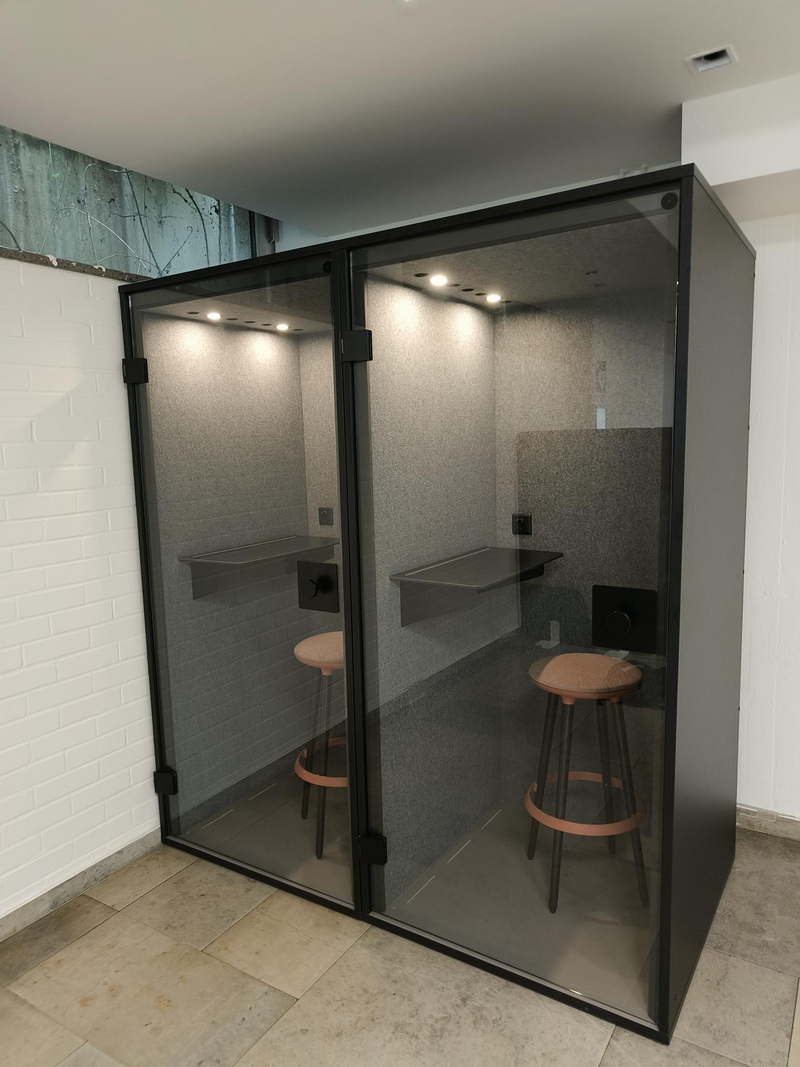 Eine besonders effiziente akustische Abschirmung wird in den sogenannten „Muteboxes“ (schallisolierte Kabinen) erzielt. Diese Rückzugsorte eignen sich sehr gut für ungestörtes Lernen und Arbeiten sowie für die Teilnahme an virtuellen (Lehr-)Veranstaltungen und Meetings, die zwischen Präsenzveranstaltungen stattfinden.