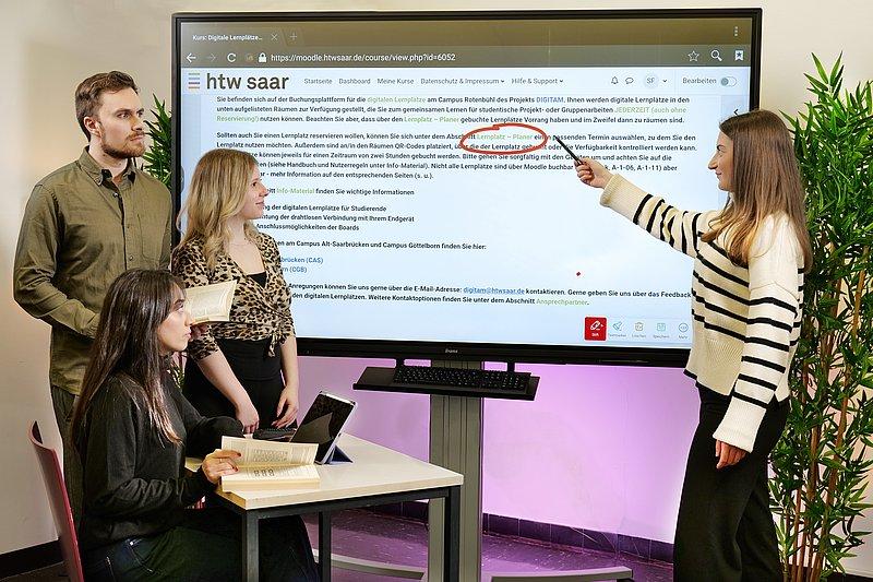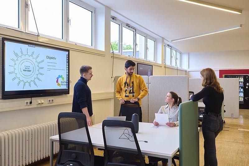 Mit Mitteln des Projekts DIGITAM (Kompetenzen für die digitale Arbeitswelt von Morgen), wurden an der htw saar im Zeitraum 2023-24 hochschulweit digitale Lernplätze für alle Studierenden aufgebaut. Ziel von DIGITAM ist die Förderung sog. Future Skills, überfachliche Kompetenzen, Fähigkeiten und Fertigkeiten, die Menschen befähigen, Herausforderungen in der aktuellen und künftigen (digitalen) Arbeitswelt und im Alltag zu begegnen. Durch die digitalen Lernplätze soll den Studierenden selbstbestimmtes und kollaboratives Lernen und Arbeiten mit aktueller technischer Ausstattung ermöglicht werden, um die in der digital geprägten Arbeitswelt schon heute benötigten Future Skills auch in informellen Lernkontexten zu fördern. Mit den mit aktuellen IT-Tools ausgestatteten sowie funktional flexibel und gestalterisch ansprechend gestalteten Lernplätzen steigert die htw saar zudem die Aufenthaltsqualität an den vier größeren Standorten und somit auch die Bildung von Lerngruppen.