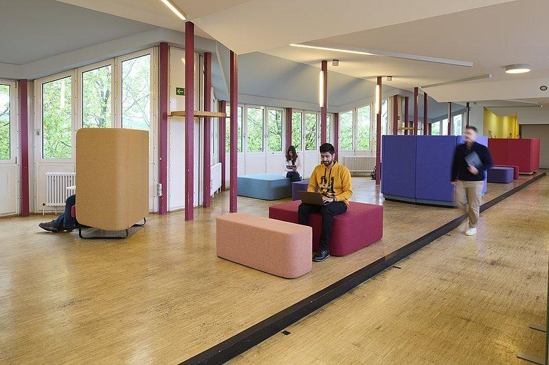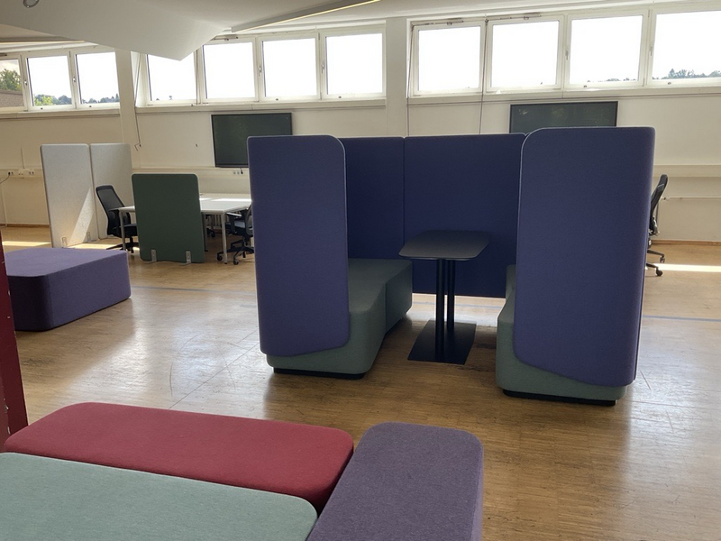 Die ausgewählten Möbel ermöglichen die flexible Nutzung als Einzel- oder Gruppenlernplätze. Das bequeme Loungemöbel besitzt neben dem angenehmen Sitzkomfort eine schallreduzierende Wirkung und ermöglicht den dort arbeitenden Studierenden ein gewisses Maß an Privatsphäre. Zum Teil konnte vorhandenes Mobiliar weitergenutzt und durch das neue Möbel ergänzt werden.