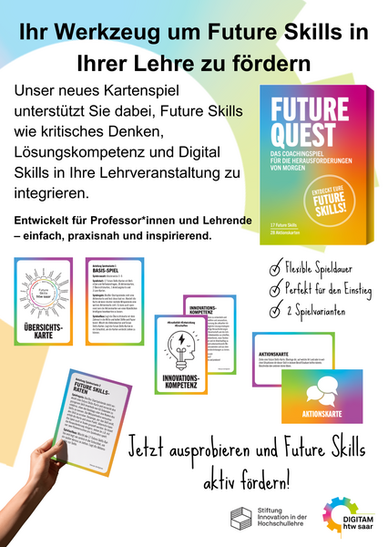 Wie lassen sich Future Skills wie Kreativität, Reflexionskompetenz oder Problemlösekompetenz wirkungsvoll in die Hochschullehre integrieren? Future Quest, das Future Skills-Kartenspiel, bietet Lehrenden ein vielseitiges Werkzeug, um genau diese Kompetenzen spielerisch und praxisnah zu fördern.