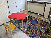 Das Zimmer ist ausgestattet mit einem Wickeltisch, einem Gitterbett, einem Hochstuhl, einer Kinder-Sitz-Ecke, verschiedenen Spielmaterialien sowie einem Schreibtisch mit Telefon. Die Einrichtungsgegenstände wurden dankeswerterweise von Möbel Martin gesponsert.