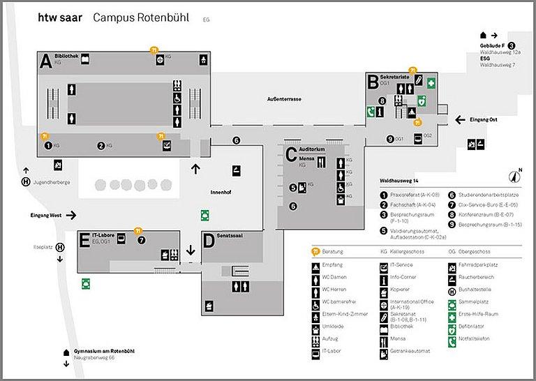 Take the train to Saarbrücken main station. Change there at the bus station. You can reach the Rotenbühl campus by bus lines 102 and 111 (bus stop "Ilseplatz"), bus lines 112 and 124 (bus stop "Prinzenweiher"). Alternatively, you can take the Saarbahn line S1 to the "Johanneskirche" stop and from there take lines 101 and 150 or 109 ("Ilseplatz" or "Prinzenweiher" stop).