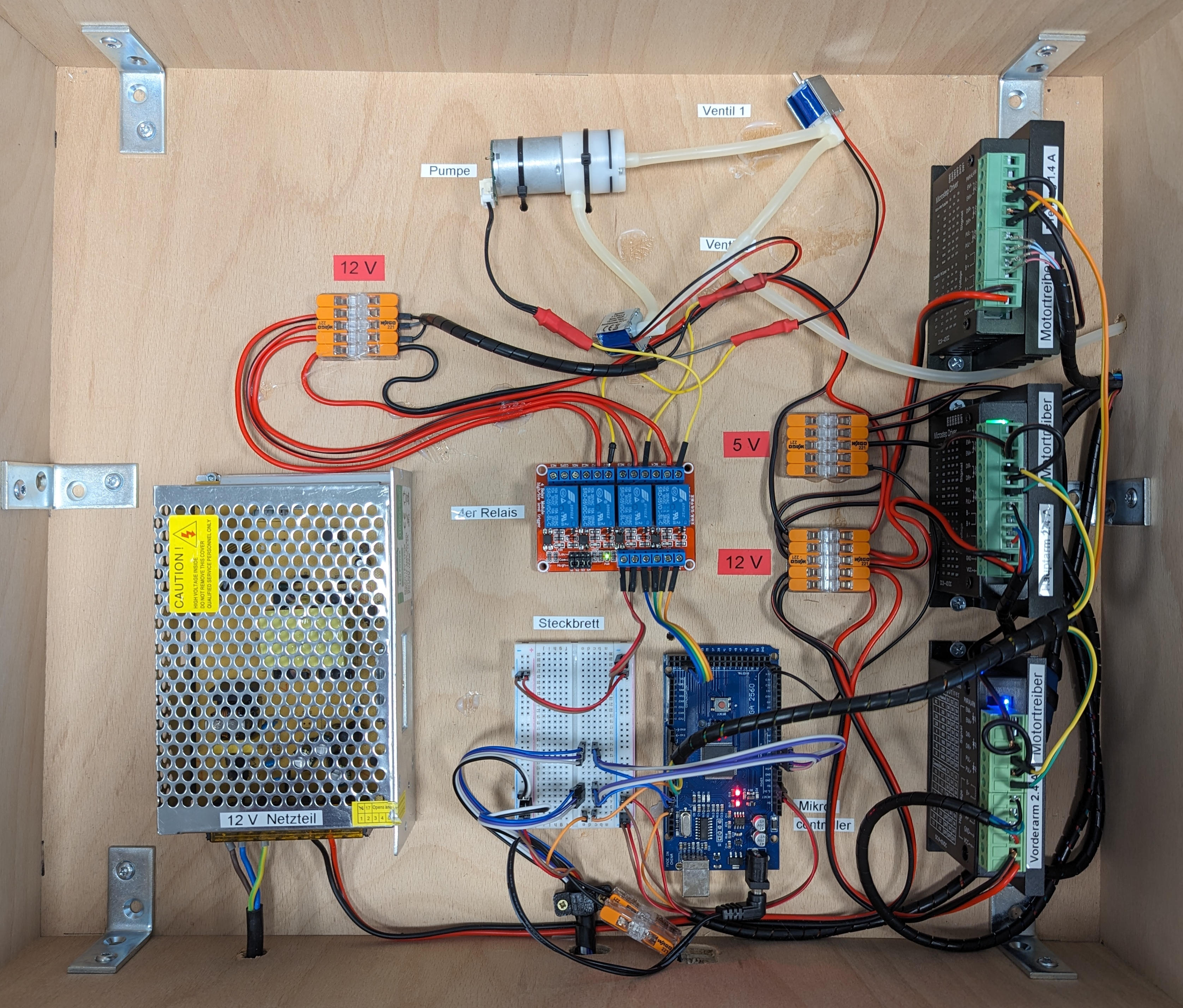 Zur übersichtlichen Darstellung der Hardwarekomponenten sind diese in einem externen Gehäuse untergebracht. Diese bestehen unter anderem aus einem 12 V-Netzteil, einem Mikrocontroller (Arduino Mega), Schrittmotortreibern, Relais, der Pneumatikpumpe und Ventilen.