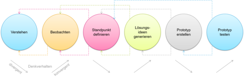 Dabei besteht Design Thinking aus einem iterativen Arbeitsprozess, der auf eine ganze Sammlung von unterstützenden Tools zurückgreift. Der Arbeitsprozess orientiert sich an der Vorgehensweise von Designern. Um erfolgreich arbeiten zu können sind Designer traditionell sehr stark darauf angewiesen, die Bedürfnisse und Anforderungen ihrer Kunden tiefgehend zu verstehen. Dabei ist besonders der Aufbau von Empathie ein wichtiges Element, welche unter anderem durch aktives Beobachten von Nutzern erreicht werden kann. Außerdem spielt in diesem Prozess der Proof of Concept, also die Erprobung von Ideen/Konzepten in der Realität, eine exponierte Rolle. So schließt sich im Design Thinking-Prozess im Anschluss an die Phase der Ideengenerierung die Erstellung eines Prototypen an, welcher ausführlich an bzw. mit den Nutzern getestet wird. Dies dient dazu die entstandenen Ideen zu verifizieren und mit zusätzlichem Feedback anzureichern, woraus eine aktive Lernerfahrung entsteht, die sich positiv auf den Innovationsprozess auswirkt.