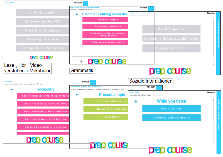 Der prep course ist unterteilt in die drei Bereiche Lese-, Hör-, Videoverstehen, Grammatik und Soziale Interaktionen.