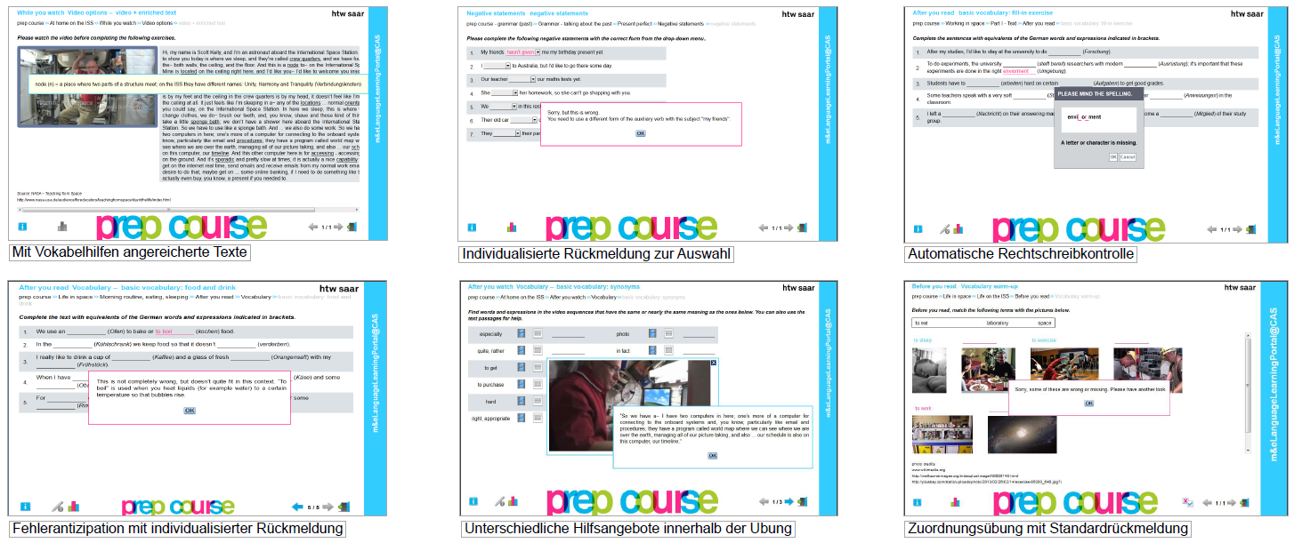 Der prep course bietet eine Vielzahl von Übungstypen, die passend zu den jeweiligen Inhalten ausgesucht wurden. So gibt es neben einfachen oder mit Vokabelerklärungen angereicherten Text-, Audio- und Videopräsentationen beispielsweise auch Zuordnungsübungen, Lückentexte, Ordnungsübungen und einiges mehr. Innerhalb dieser Übungstypen gibt es unterschiedliche Funktionalitäten, die sowohl die Interaktivität erhöhen als auch die Lernprogression der Studierenden zusätzlich unterstützen. Dazu gehören beispielsweise die automatischeRechtschreibkontrolle, das Akzeptieren von Mehrfachantworten, oder auch die individuellen Rückmeldungen, z.B. in Form von schriftlichen Erklärungen oder Audioclips.