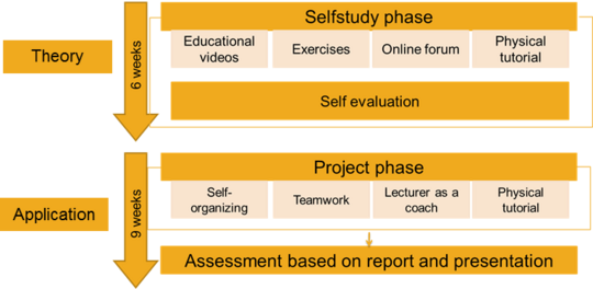 Die neue Lehrform motiviert Studierende selbständig zu arbeiten und befähigt sie, die Arbeit in interdisziplinären Teams zu organisieren. Die beschriebenen Veranstaltungen bestehen aus zwei Teilen, welche jeweils durch innovative Lehr-Methoden unterstützt sind. Der erste Teil dient der Vermittlung theoretischer Inhalte, die für die Bearbeitung der Problemstellung im späteren Praxis-Teil notwendig sind. Hier greift das Konzept des Inverted Learnings [1]. Alle theoretischen Inhalte werden den Studierenden im Learning Management System (LMS) der htw saar „Clix“ als Lehrvideos zur Verfügung gestellt. Dies hat vor allem zum Vorteil, unterschiedliche Wissensstände durch Vorkenntnisse der Gruppe anzugleichen. Die Möglichkeit der Online-Tutorials ermöglicht jedem und jeder Studierenden im eigenen Lerntempo zu arbeiten, wie es in Präsenzveranstaltungen selten der Fall ist. Außerdem ermöglicht diese Form der Wissensvermittlung den Studierenden eine freie Einteilung der Lernzeit und somit mehr Flexibilität, was etwa hinsichtlich möglicher Erwerbstätigkeit neben dem Studium oder bei Familienpflichten sehr hilfreich für die Studierenden ist. Die Lehrvideos haben eine Länge von 5-12 Minuten und wurden extra für diese Veranstaltung produziert. Diese werden durch Übungsaufgaben, Quizzes zum Selbsttest, Kann-Listen (entnommen aus dem SOL-Konzept [2]) und Lern-Reflexions-Bögen ergänzt.