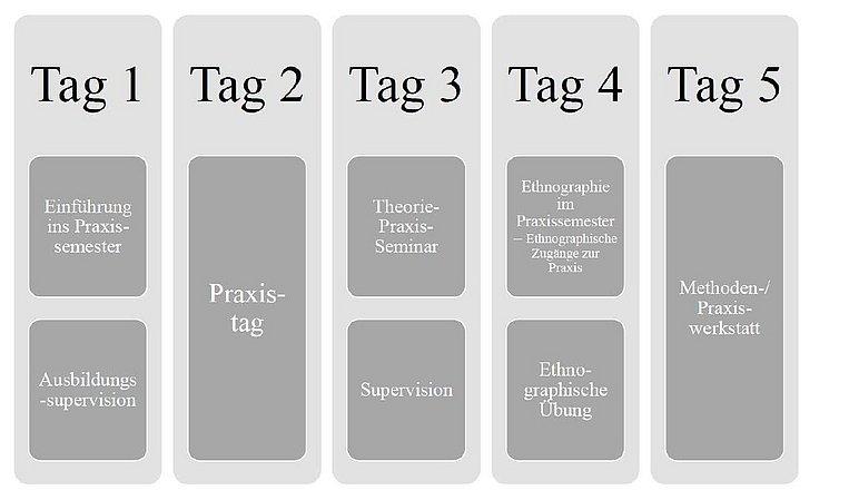 Die Blockwoche dient der Einführung der Studierenden in die Rahmenbedingungen des Praxissemesters und findet Ende August/ Anfang September eines jeden Jahres statt. Die Blockwoche ist Bestandteil der Seminare zum Praxissemesters und damit ein verpflichtender Teil des Praxissemesters. Die Klärung der organisatorischen Rahmenbedingungen, wie die Einteilung in die Supervisionsgruppen und Theorie-Praxis-Seminare, sind ebenso Bestandteil der Blockwoche wie die Einführung in die methodologische und methodische Ausgestaltung des Praxissemesters mit ersten Übungen. Auch findet, falls dies im Vorfeld noch nicht geschehen, eine erste Hospitation in der gewählten Praxiseinrichtung statt sowie die Teilnahme an einer ersten Supervision und dem Theorie-Praxis-Seminar. Im Fokus stehen dabei in dieser Woche auch die eigenen Vorerfahrungen, Erwartungen und Ziele der Studierenden.