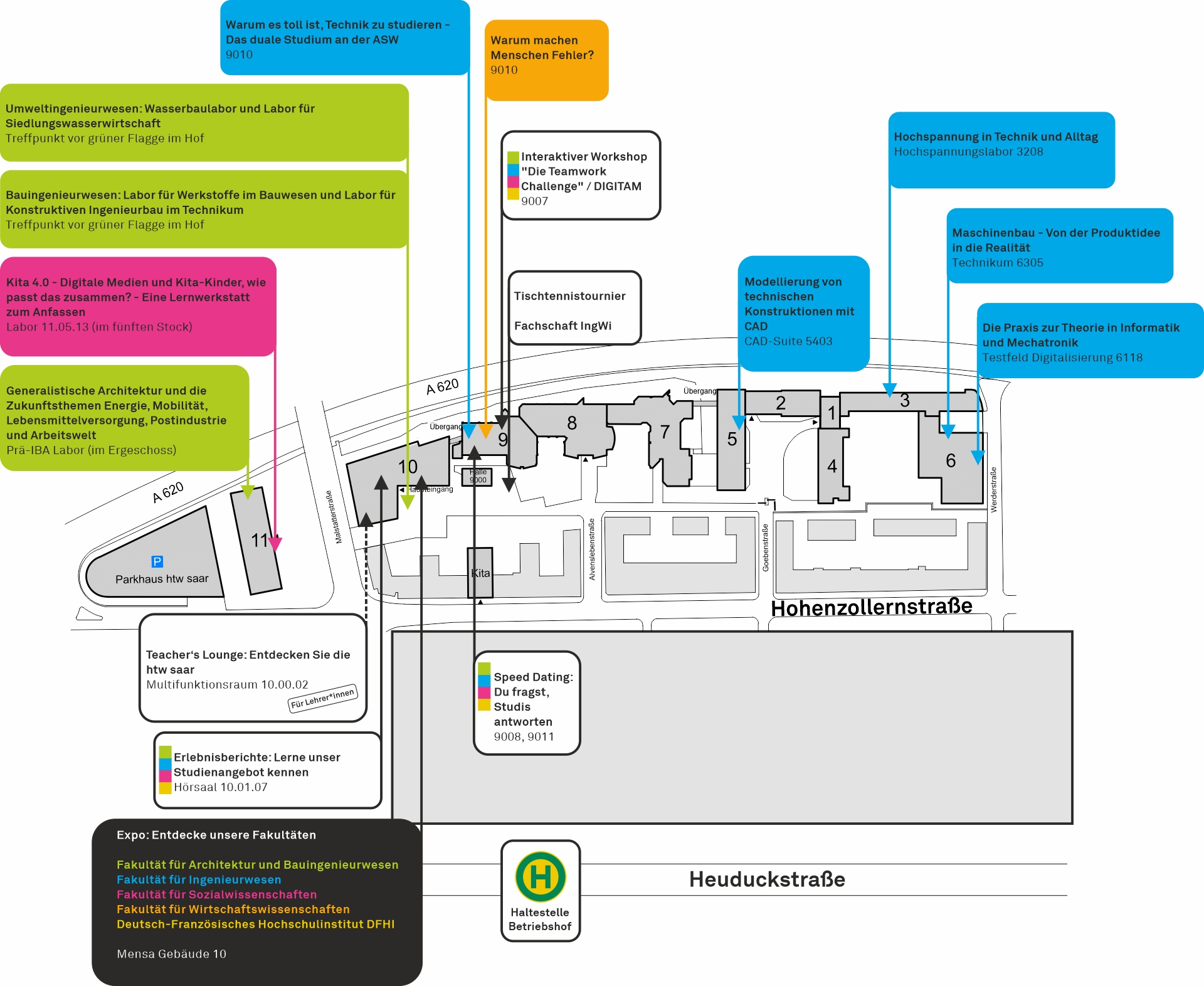 Entdecke die Vielfalt der htw saar an unseren Messeständen der Fakultäten.