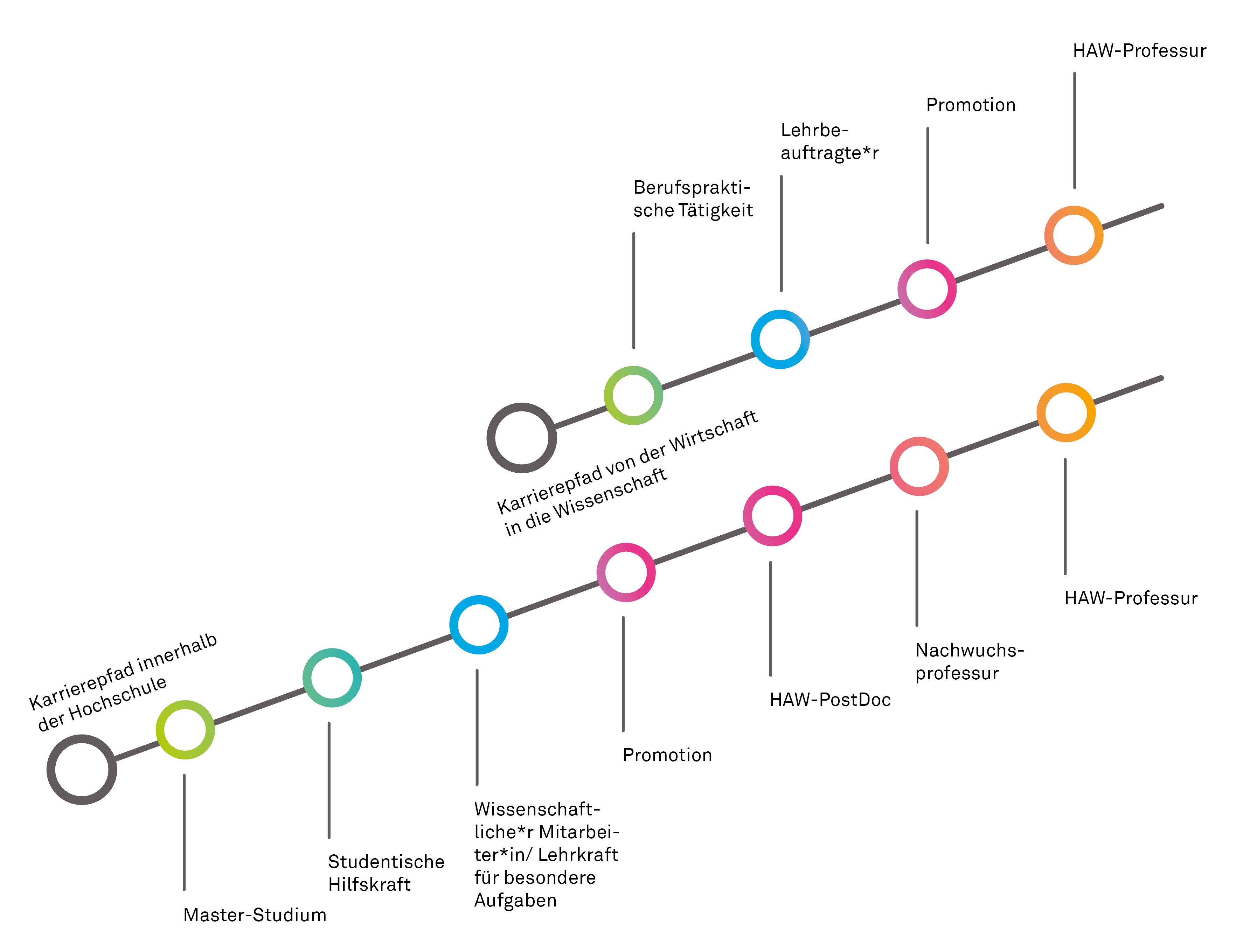 Career paths at a university of applied sciences (not all levels can be achieved in direct succession or follow on directly from one another, e.g. HAW-PostDoc and junior professorship are alternative qualification levels)