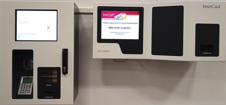EC recharging stations are located next to the validation stations in Building 10 at the entrance to the cafeteria at the Alt-Saarbrücken Campus and in the hallway to the cafeteria at the Rotenbühl Campus.