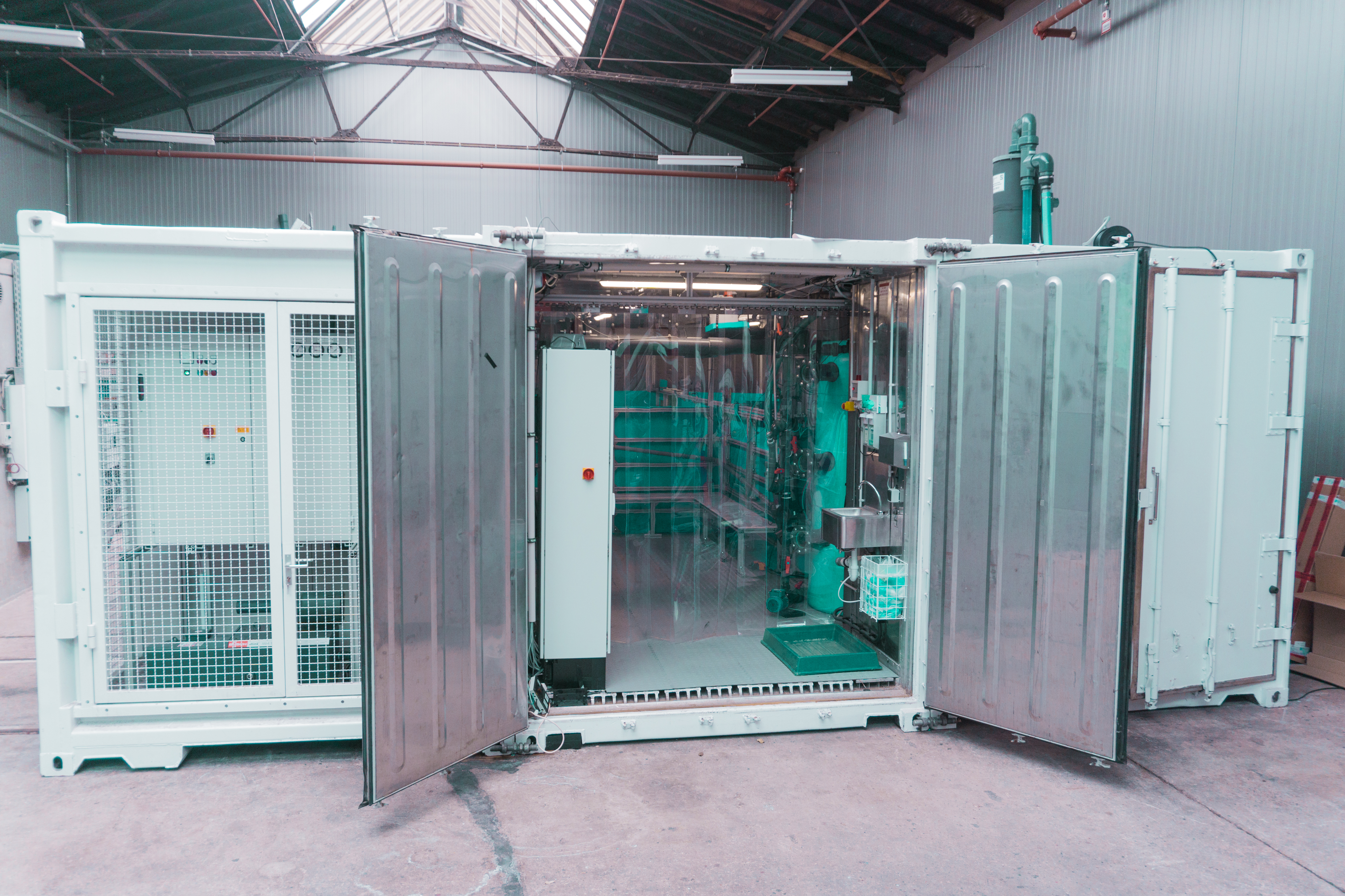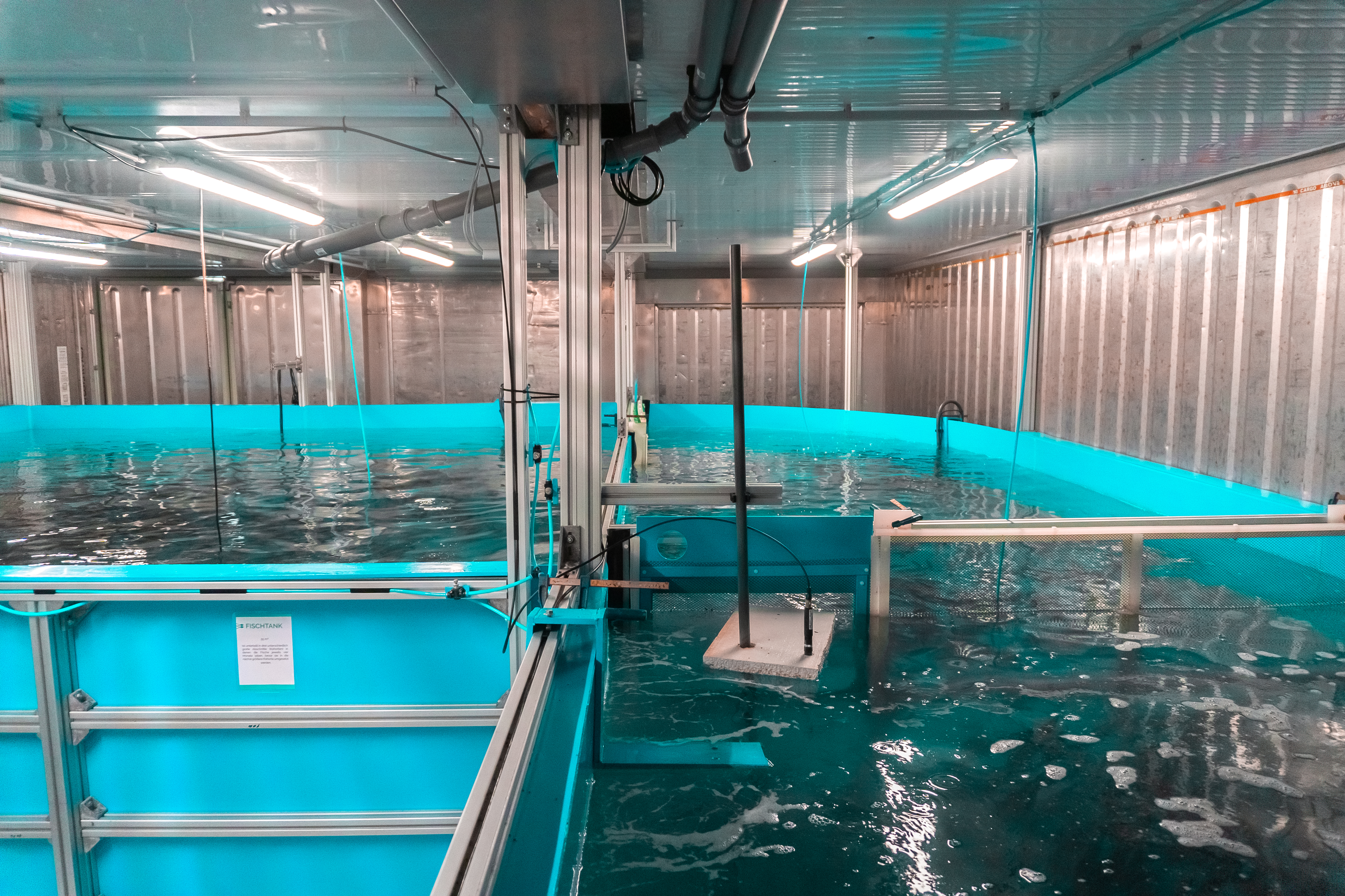 Sobald die Wolfsbarsche entdecken, dass jemand in ihr Becken schaut, entsteht ein Tumult, der das Wasser aufpeitscht: Sie hoffen, jetzt gibt es Futter. Bei SEAWATER Cubes steht ein großes Becken mit drei Bereichen, in denen Wolfsbarsche in ihrer jeweiligen Wachstumsstufe schwimmen. Ein ganzes Jahr braucht es, bis ein Wolfsbarsch reif für den Verzehr ist. »Dass wir jetzt auch Fisch verkaufen, war unvermeidlich, denn er wurde sehr stark nachgefragt«, sagt Carolin Ackermann, Mitgründerin und CEO von SEAWATER Cubes.