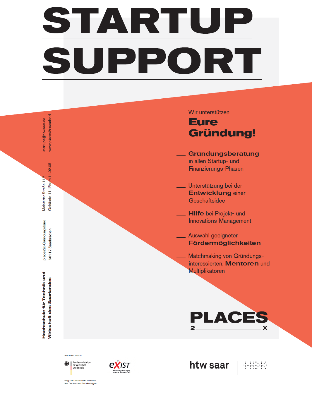 Sprechen Sie uns gerne an unter startups oder direkt über das Kontaktformular. Wir, das Team des places2x-Gründungsbüros, warten auf Sie. @ htwsaar .de