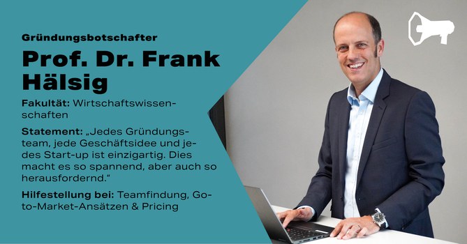 Er hat einen disruptiven Ansatz entwickelt, um den lokalen Handel zu stärken, sich mit Sharing Economy in der Textilindustrie beschäftigt und forscht zu Mobile Commerce und Mobile Payment. Prof. Hälsig unterstützt auch verschiedene EXIST-Anträge und ist Vorstandsmitglied im Marketing Club Saar und Mitglied im Arbeitskreis Hochschule und Wirtschaft der Freunde und Förderer der htw saar e.V. sowie im Saarbrücker Alumni Netzwerk (SAN). Er ist auch Mentor und Referent beim Saarland Accelerator. Seit knapp drei Jahren ist Prof. Dr. Frank Hälsig als Co-Founder bei dem saarländischen Startup alocalo GmbH tätig.