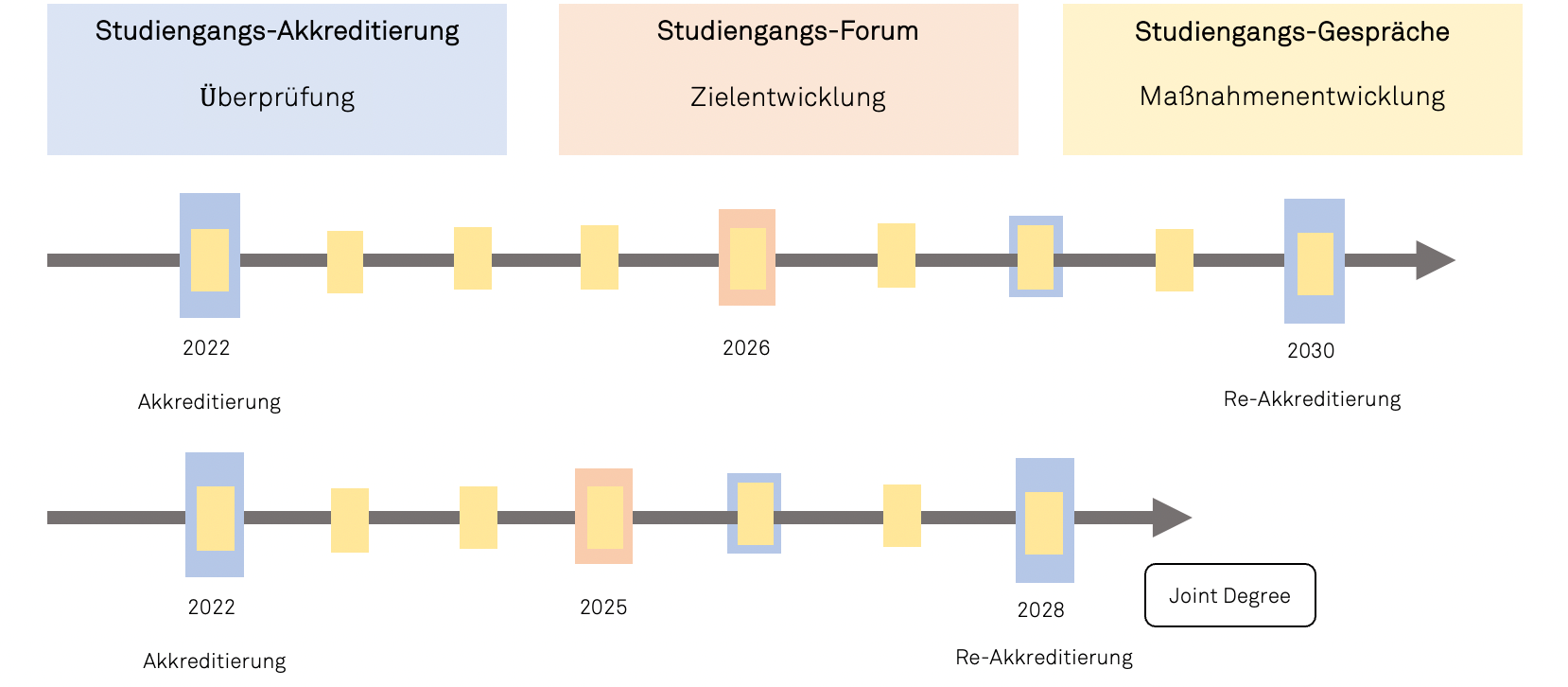 Der Akkreditierungszyklus beträgt 8 Jahre, bei Joint Degrees 6 Jahre.