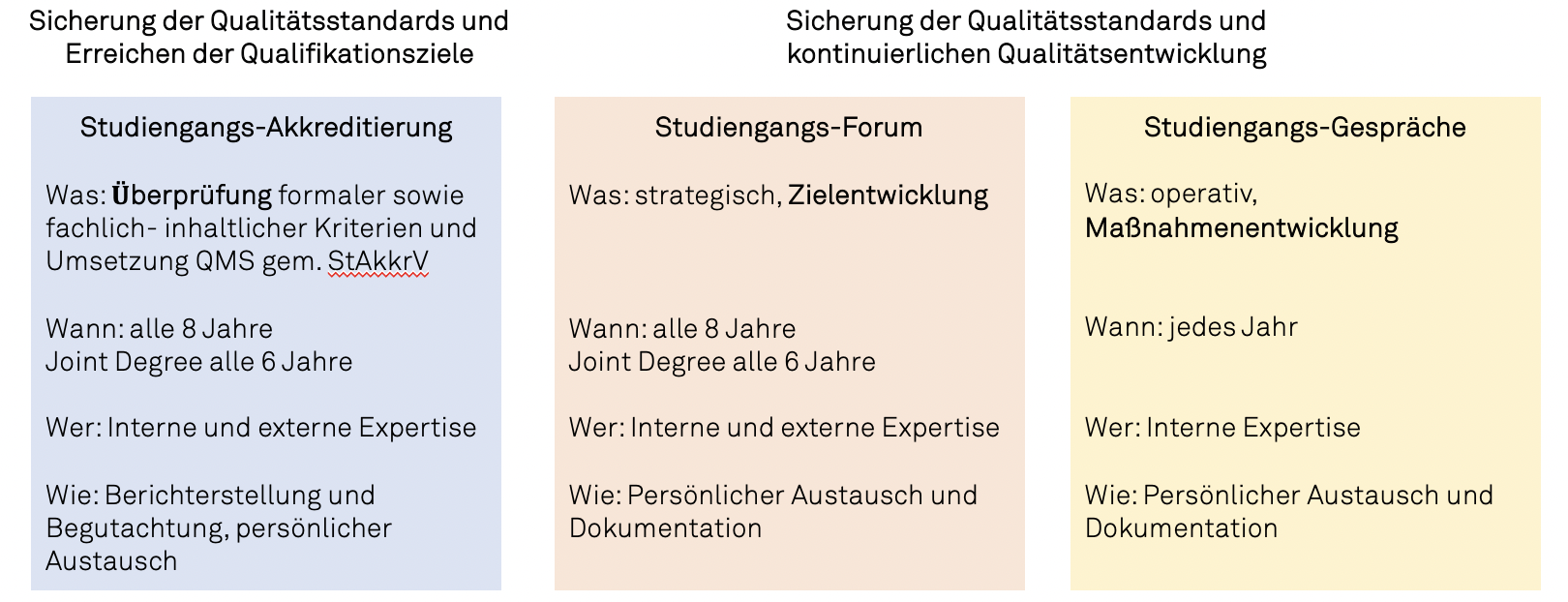 Das QMS an der htw saar wurde akkreditierungsorientiert entwickelt und beruht auf drei Qualitätssicherungs-Verfahren: Studiengangs-Akkreditierung, Studiengangs-Forum und Studiengangs-Gespräche.