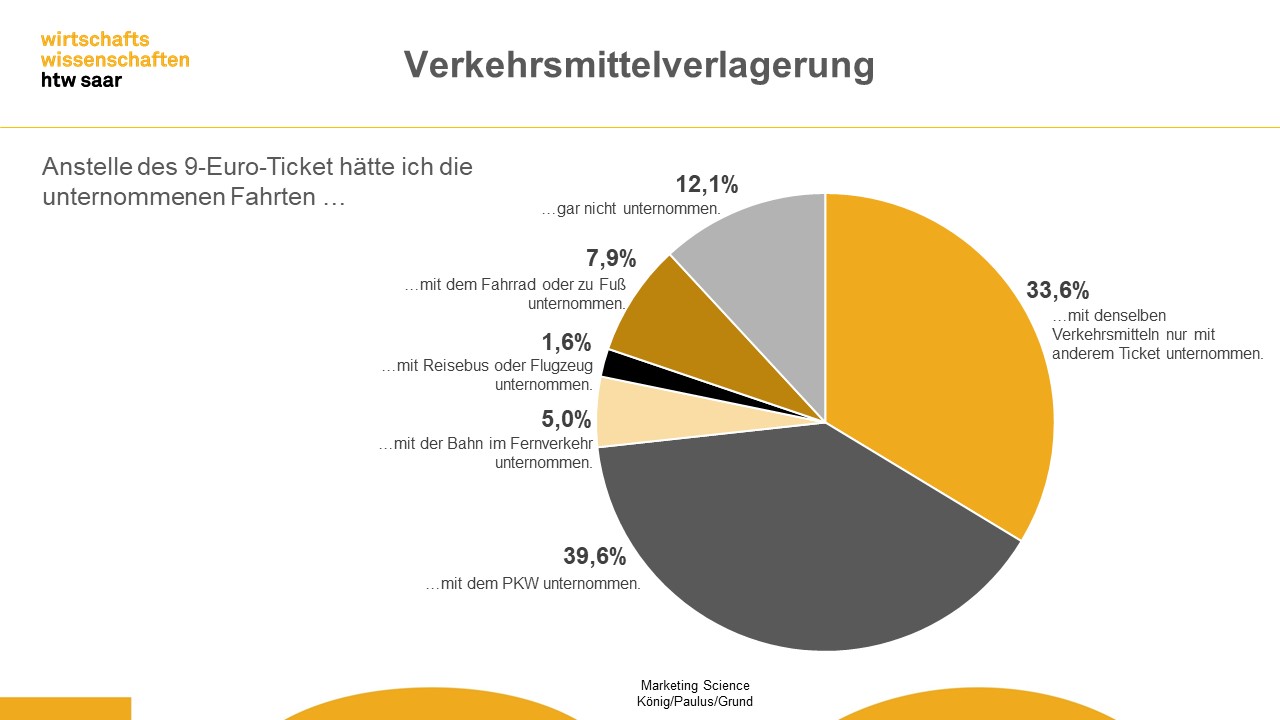 Das 9-Euro-Ticket wurde zu mehr als 40 Prozent des Reisezwecks vor allem zum Pendeln, also für den Weg zur Arbeit, Schule oder Ausbildungsstätte genutzt, von den bisherigen Nicht-Nutzern des ÖPNVs sogar zu knapp 50 Prozent. Auf „Alltägliche Erledigungen“ entfallen gut ein Fünftel der Fahrten und jeweils ca. 10 Prozent auf „Reisen“, „Besuche von Freunden/Familie“ und „Ausflüge“. Besonders spannend sind die Ergebnisse zur Verkehrsmittel-Verlagerung. Bei nahezu 40 Prozent der Fahrten hätten die Befragten ohne das 9-Euro-Ticket den PKW genutzt, bei den bisherigen ÖPNV-Nicht-Nutzern sind es knapp 70 Prozent. Ein Drittel der Fahrten wäre mit einem anderen ÖPNV-Ticket und ca. 12 Prozent überhaupt nicht unternommen worden. Bei knapp 8 Prozent der Strecken haben die Befragten das 9-Euro-Ticket anstelle des Fahrrads genutzt oder wären zu Fuß gegangen. Dieser Wert ist genauso wie die Verlagerung vom Fernverkehr (Bahn) mit 5 Prozent sowie vom Reisebus oder Flugzeug (1,6 Prozent) auffällig stimmig mit den bundesweit erhobenen Daten zum 9-Euro-Ticket von exeo-consulting, an deren Studien sich die Saarland-Erhebung orientiert hat. Die verhältnismäßig geringe Kannibalisierung anderer ÖPNV-Tickets und die überproportionale Verlagerung vom PKW auf den ÖPNV zeigen starke Abweichungen zum Bundesdurchschnitt. Diese können der überproportionalen PKW-Nutzung im Saarland geschuldet sein.