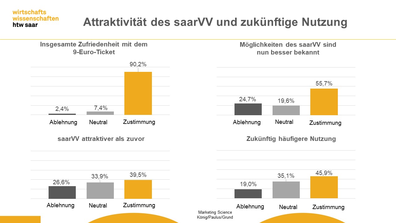 Das 9-Euro-Ticket scheint auch langfristige Effekte zu haben (sogenannte Carry-Over): Nahezu 40 Prozent der Befragten lehnen die Aussage ab, dass sich ihr ÖPNV-Nutzungsverhalten im Vergleich zu der Zeit vor dem 9-Euro-Ticket nicht ändern wird. Weniger als 18 Prozent der Befragten meinen, dass sich der Kauf des Tickets nicht gelohnt habe. Die Studie zeigt eine hohe Zufriedenheit der Befragten mit dem 9-Euro-Ticket: 90 Prozent der Nutzer zeigen sich zufrieden oder sehr zufrieden. 55 Prozent sind die Möglichkeiten des saarVV nun besser bekannt, knapp 40 Prozent stufen den saarVV nun attraktiver ein als zuvor und 45 Prozent wollen den ÖPNV künftig häufiger nutzen. Die Mehrheit macht die weitere Nutzung von Bussen und Bahnen von den künftigen Ticketpreisen und mehr als 70 Prozent vom Fahrplan-Angebot abhängig.
