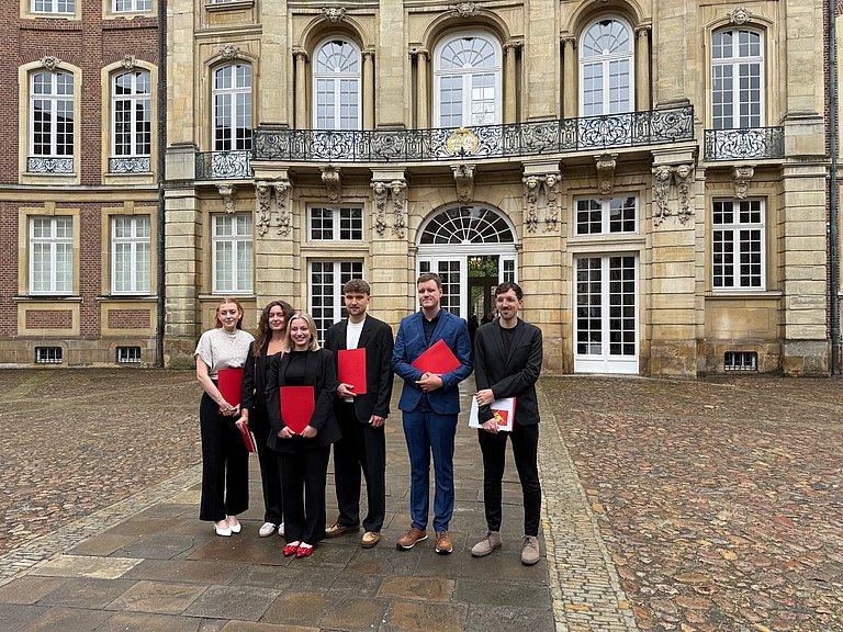 Preisträger*innen der htw saar (v.l.n.r): Michelle Dufour, Klara Sauer, Viktoria Stiefel, Janis Velten, Leon Klauck und Peter Bonaventura vor dem Erbdrostenhof in Münster.