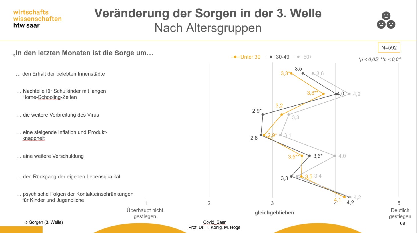 Ein Vergleich der Befragungsergebnisse innerhalb der „Covid_Saar“-Studie zeigt die Belastungen verschiedener Bevölkerungsgruppen in den einzelnen Pandemiephasen aber auch Positives sowie Zukunftswünsche für die Post-Covid-Zeit auf. Viele verzeichneten einen Arbeitsanstieg – deutlich weniger einen Einkommensanstieg. Über die Bevölkerungsgruppen hinweg zeigt sich: Ältere Befragte sorgen sich mehr um langfristige Folgen, fühlen sich aber deutlich weniger betroffen und eingeschränkt als jüngere Befragte.