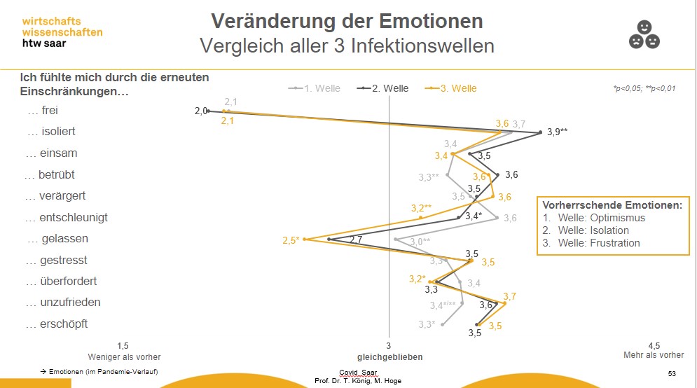 Mit der „Covid Saar“-Studie hat ein Forscherteam der Hochschule für Technik und Wirtschaft des Saarlandes (htw saar) aus dem Bereich empirisches Marketing um Prof. Dr. Tatjana König seit Frühjahr/Sommer 2020 über 1.900 Saarländer im Alter von 18 bis 87 Jahren befragt. Das von der Staatskanzlei mit Mitteln aus dem Landesforschungsförderungsprogramm geförderte Projekt geht der Frage nach, wie sich die COVID-19-Zeit auf das Leben im Saarland in und nach der Pandemie auswirkt. Nun liegen weitere Ergebnisse der Befragung während der dritten Infektionswelle vor, bei der es durch die Unterstützung des Netzwerks Onlinerland Saar gelungen ist, verstärkt ältere Saarländer in die Erhebung einzubinden. Auch ein erstes Fazit zu den Entwicklungen über die verschiedenen Lockdown-Phasen hinweg zeigt, dass in den verschiedenen Pandemiephasen unterschiedliche Sorgen, Emotionen und Wünsche dominierten. In den verschiedenen Bevölkerungsgruppen konnte das Forscherteam spürbare Auswirkungen der Corona-Pandemie messen, wenn auch in unterschiedlichen Formen und Ausprägungen. Insgesamt weisen die Einbußen in Lebenszufriedenheit und Wohlbefinden nicht auf Gewöhnungseffekte an die Corona-Situation hin.