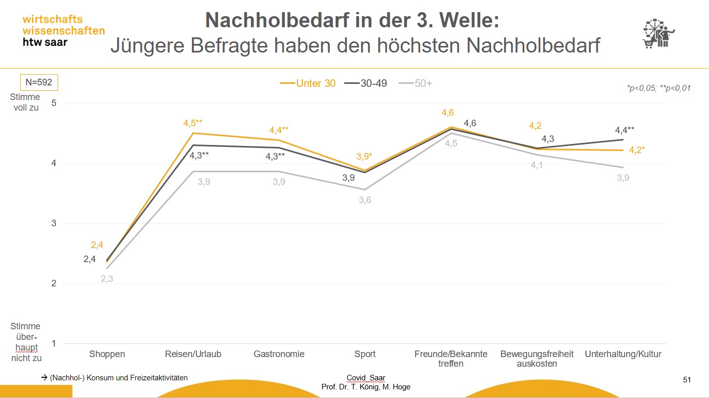 Mit der aktuell letzten Befragung hat das Forscherteam auch interessiert, wie die Menschen im Saarland wiedergewonnene Freiheiten nutzen möchten. Insgesamt haben nur ca. 18 % der Befragten kein oder nur ein geringes Bedürfnis, schnellstmöglich einiges davon nachzuholen, auf das lange verzichtet wurde. Mehr als drei Viertel der Befragten verspüren einen Nachholbedarf beim Reisen und bei Gastronomie-Besuchen. Der größte Nachholbedarf zeigt sich bei den Saarländer*innen im Bereich soziale Kontakte: knapp neun von zehn Befragten wollten möglichst schnell wieder Freunde und Bekannte treffen. Der geringste Nachholbedarf scheint im Bereich Shopping zu bestehen. Darüber hinaus zeigte sich, dass Befragte über 50 Jahren ein deutlich niedrigeres Kompensationsbedürfnis haben als jüngere Saarländer*innen, welche die Einschränkungen der Freizeit-Aktivitäten stärker betroffen hat (s. Abb. 4).