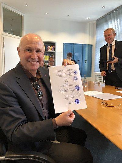 V.L.n.R.: Prof. Dr.-Ing. Dieter Leonhard, Präsident der htw saar, Bernd Reis, Hauptgeschäftsführer der Handwerkskammer des Saarlandes