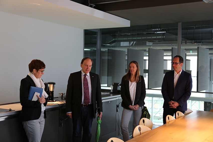 Ministerpräsidentin Kramp-Karrenbauer zeigte sich bei ihrem Rundgang erfreut über die neuen Arbeitsbedingungen auf dem Gelände. „Schon bei den ersten Schritten auf dem neuen Interimscampus spürt man, hier wird Kreativität gelebt. Anstatt Kohle werden nunmehr in Göttelborn Wissen und Ideen gefördert, das ist eine spannende Entwicklung dieses Zukunftsstandortes. Für uns als Landesregierung war immer wichtig, dass auch bei einer Interimslösung keine Abstriche an die Qualität der Lehr- und Studiensituation gemacht werden. Im Gegenteil: Wir wollten für alle Beteiligten die besseren Lehr-, Lern- und Arbeitsbedingungen wie sie auch im Hochhaus vorgesehen waren.“