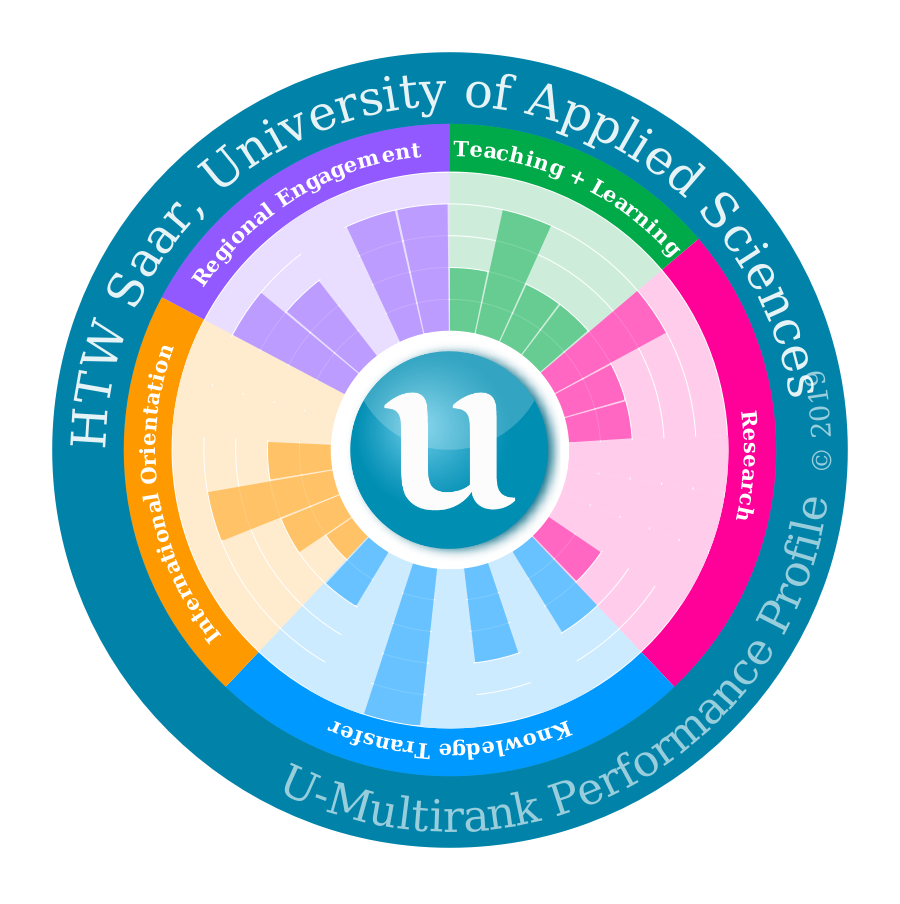 Zum dritten Mal hat die Hochschule für Technik und Wirtschaft des Saarlandes (htw saar) am internationalen Hochschulranking U-Multirank teilgenommen. Dieses liefert zu über 1.700 Hochschulen in 96 Ländern vielfältige Informationen in den fünf Dimensionen Forschung, Lehre, Internationalität, Wissenstransfer und regionales Engagement. Ihr Gesamtprofil zeigt mit 3 Mal „sehr gut“ und sieben Mal „gut“ Spitzenleistungen über verschiedene Indikatoren hinweg. Der Vizepräsident für Studium, Lehre und Internationalisierung, Prof. Dr. Andy Junker, zum Ergebnis: „Wir sind stolz, als gründungsstarke Hochschule erneut in den Kategorien Spin-Offs und Unternehmensgründungen von Absolventinnen und Absolventen Spitzenwerte erreicht zu haben.“ In der Kategorie Forschung kann die Hochschule mit ihrer großen Zahl an strategischen Partnerschaften in der Region ihren Spitzenwert halten. Gemeinsam mit ihrem Institut für Technologietransfer (FITT) ist die htw saar ein zentraler Partner für Unternehmen und Institutionen der Region, wenn es um Forschung, Entwicklung und Wissenstransfer geht.