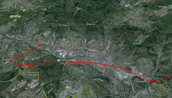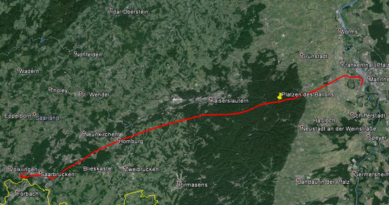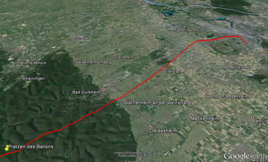Während der Startphase ist deutlich zu erkennen, dass Piggeldy in Richtung Südwesten startet, bevor der Ballon in einer Höhe von 1900m über der Ortschaft Klarenthal eine scharfe Kurve vollzieht und nach Osten weiterfliegt.