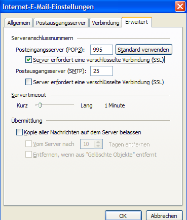 Die E-Mailserver von ECC antwortet nur auf verschlüsselte Abfragen, aus diesen Grund müssen Sie "Server erfordert verschlüsselte Verbindung (SSL)" aktivieren.