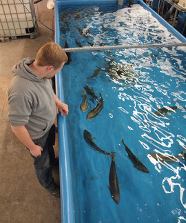 Bild 5: Haltungsbecken eines Fluid-Kreislaufs mit Gelbschwanzmakrelen, Seriola lalandi. Beobachtung der Tiere durch Andreas Kulakowski.