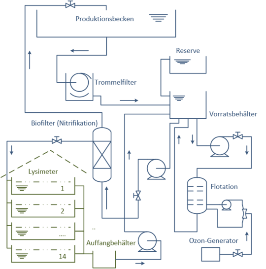 In der MFV-Forschungshalle der HTW wurde ein experimenteller primärer Fluid-Kreislauf (Bild 3) aufgebaut, der mit seiner internen Wasseraufbereitung Prozesswasser mit einem typischen Nährstoffmuster zu einem sekundären Kreislauf für die Nährstoffverwertung durch Halophyten liefert. Der sekundäre Kreislauf (Pflanzenreaktor) mit 14 Lysimetern (Pflanzbetten) als Reinigungsstufen wurde in einem Gewächshaus auf dem Außengelände aufgebaut. Der primäre Fluid-Kreislauf wurde nach der Funktionsprüfung mit Fischen besetzt. Die Lysimeter wurden mit Plantago coronopus (Wegerich) und Aster tripolium (Strandaster) in Betrieb genommen. Mittlerweile wird zusätzlich die Filterleistung von Salicornia sp. (Queller) und Atriplex portulacoides (Strand-Salzmelde) überprüft.