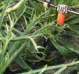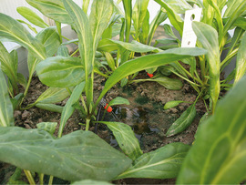 Bild 5: Plantago Coronopus im Lysimeter. Hinten im Bild ein Tropfenverteiler für die kontinuierliche Bewässerung