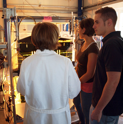 Bild 4: Projektbesprechung mit Mitarbeitern und Studenten vor einem Photobioreaktor für die Zucht von Mikroalgen.