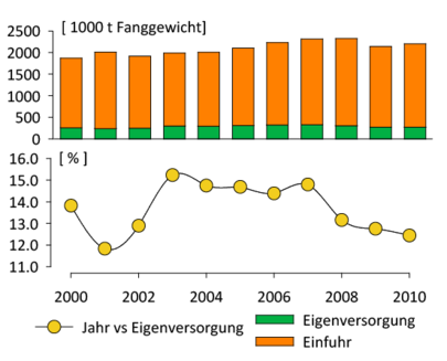 Die Anlandungen aus unseren typischen Fanggebieten der Seefischerei zeigen dagegen einen abnehmenden Trend. Das Defizit wird zu einem Teil mit Anlandungen aus fremden Fischereigebieten ausgeglichen, die, wie die Daten in Bild 6 zeigen, nicht unbedingt dauerhaft befischt werden können. Marine Fischereiprodukte werden auf dem deutschen Markt knapp, aber nachgefragt sein, was aus den eigenen Fischereierträgen und den Importen abgeleitet werden kann (Bild 7). Die Eigenversorgung in Deutschland betrug bei steigendem Konsum von Fischereiprodukten im Jahr 2010 nur noch 13%. Es ist anzunehmen, dass die geringe eigene Versorgung aus der Fischerei zu deutlichen Engpässen im Bereich der Frischprodukte führen wird, werden nicht in erheblichem Umfang und über lange Transportwege Frischwaren importiert. Dieser Lebensmittelsektor könnte in Deutschland durch Aquakultur nachhaltig versorgt werden. Da vorwiegend marine Fische, Krebs- und Weichtiere ausfallen, ist die Entwicklung einer nachhaltigen Meeres-Aquakultur, die Marikultur, notwendig.