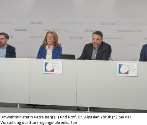 Am 8. April 2025 haben Umweltministerin Petra Berg und Prof. Dr. Alpaslan Yörük von der htw saar neue Gefahrenkarten und Modellierungen für Starkregenereignisse vorgestellt. Diese zeigen u.a. erstmals, welche Gebiete in einem „Worst Case“-Szenario betroffen wären, wie hoch die Überflutung ausfallen könnte und welche Verkehrs-, Zugangs- und Rettungswege aufgrund hoher Fließgeschwindigkeiten oder großer Wassertiefen riskant oder sogar nicht passierbar wären. Das Pfingsthochwasser 2024 hat deutlich gezeigt, dass jederzeit mit extremen Hochwasser- und Starkregenereignissen gerechnet werden muss. Daher hat das Umweltministerium im Rahmen des Forschungsprojekts „Starkregen- und Erosionsgefahrenkarten des Saarlandes“ Karten für extreme Starkregenereignisse durch Prof. Dr. Alpaslan Yörük und sein Team von der htw saar erstellen lassen. Diese Karten stellen eine Brücke zwischen Vorsorge und Gefahrenabwehr dar. Sie zeigen Überflutungsflächen von Starkregen mit Wassertiefen, Fließwege mit Richtungen und Geschwindigkeiten sowie Überflutungsflächen an den Flüssen Blies, Prims und Saar bei extremem Flusshochwasser. Die Berechnungen basieren auf einem zweidimensionalen Oberflächenabflussmodell und einem 3D-Geländemodell. Für Starkregen wurden ein 100-jährliches Ereignis mit 39,6 bis 44,2 Millimeter Regen pro Stunde und ein Extremereignis mit 200 Millimeter Regen pro Stunde betrachtet. Im Vergleich: Beim saarländischen Pfingsthochwasser 2024 wurden 113 Millimeter in 24 Stunden gemessen.