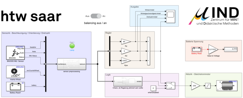 Die Steuerung des Systems erfolgt mit SIMULINK®, einer Software, die grafisch programmiert wird und mit eindimensionalem Signalfluss arbeitet. In der Simulation werden die Kategorien Sensorik, Regler, Logik, Ausgabe, Batterie und Aktorik farblich voneinander getrennt, wodurch der Regelkreis besser sichtbar wird. Der Demonstrator hilft so beim Verständnis der Regelungstechnik und erklärt greifbar das Verhalten von P-Geregelten Systemen.