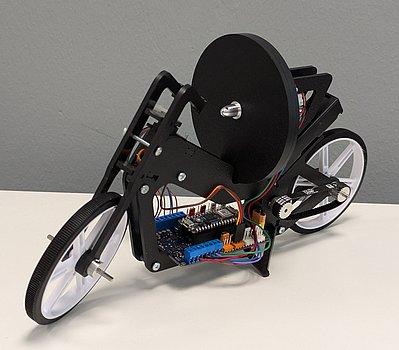 Gesteuert wird das System über einen Microcontroller, der mit einem Beschleunigungssensor, einem Gyroskop und einem Drehzahlsensor verbunden ist. Während der Controller so die Zustände des Motorrads genau erfassen kann, ist er gleichzeitig mit einem Motortreiber zur Steuerung des Gleichstrommotors verbunden. Aufgabe des Controllers ist es nun, permanent die Lage des Motorrades zu messen und den Motor so anzutreiben, dass das Kippmoment nie so groß wird, dass das Motorrad umfällt.