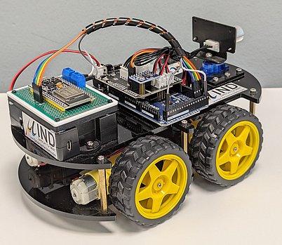 Dieser Fahrroboter verfügt über zwei Mikrocontroller: Einen Arduino MEGA zur Steuerung der Motoren und einen ESP32, der über WiFi mit einer Fernsteuerung kommunizieren kann. Dazu erzeugt der ESP32 ein WiFi-Signal, auf das ein internetfähiges Gerät (Smartphone, Laptop, ...) zugreifen kann. Nachdem die App bei erfolgreicher Verbindungsherstellung übertragen wurde, kann diese im Browser des Endgerätes geöffnet und zur Fernsteuerung verwendet werden.