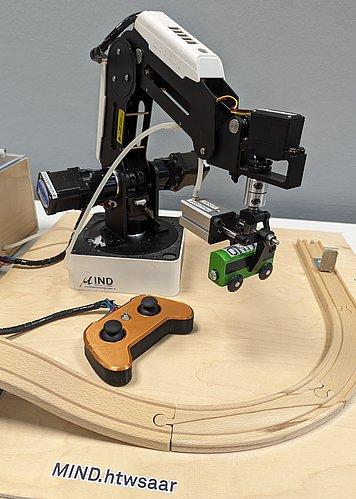 Unser steuerbarer 4-Achs-Roboterarm kann über einen Controller mit Joysticks bewegt und für periodische Pick&Place-Anwendungen angelernt werden. Er verfügt über drei Schrittmotoren für die Bewegung des Arms, einen Servomotor für die Drehung der Greifzange und eine Pneumatikpumpe mit Ventilen zur Betätigung des Greifmechanismus.