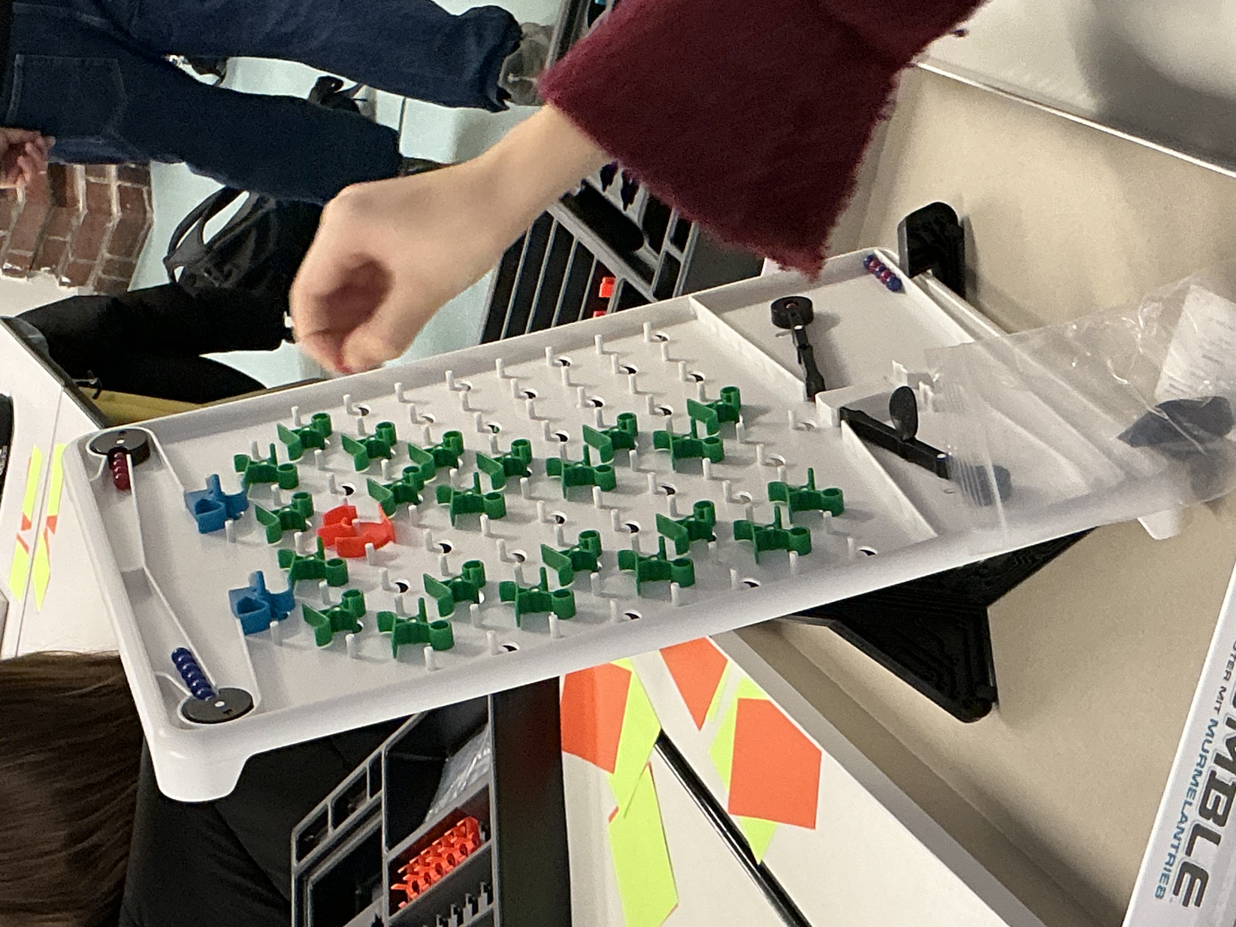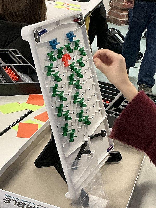 Nach der Einführung startete der praktische Teil. Die Schüler*innen bekamen Rätsel mit unterschiedlichen Schwierigkeitsstufen. In kleinen Gruppen bauten sie ihre Lösungen auf den Spielbrettern und testeten sie mit den Kugeln. Die Aufgaben wurden nach und nach schwieriger, sodass alle mitmachen konnten und trotzdem immer neue Herausforderungen hatten. Die Schüler*innen waren von Anfang an engagiert. Sie probierten viel aus, beobachteten genau den Lauf der Kugeln und änderten ihre Aufbauten, wenn etwas nicht funktionierte. Dabei wurde viel diskutiert, gelacht und gemeinsam überlegt. Besonders schön war zu sehen, dass einige Gruppen auf ganz eigene, kreative Lösungen gekommen sind, die trotzdem zum richtigen Ergebnis geführt haben.