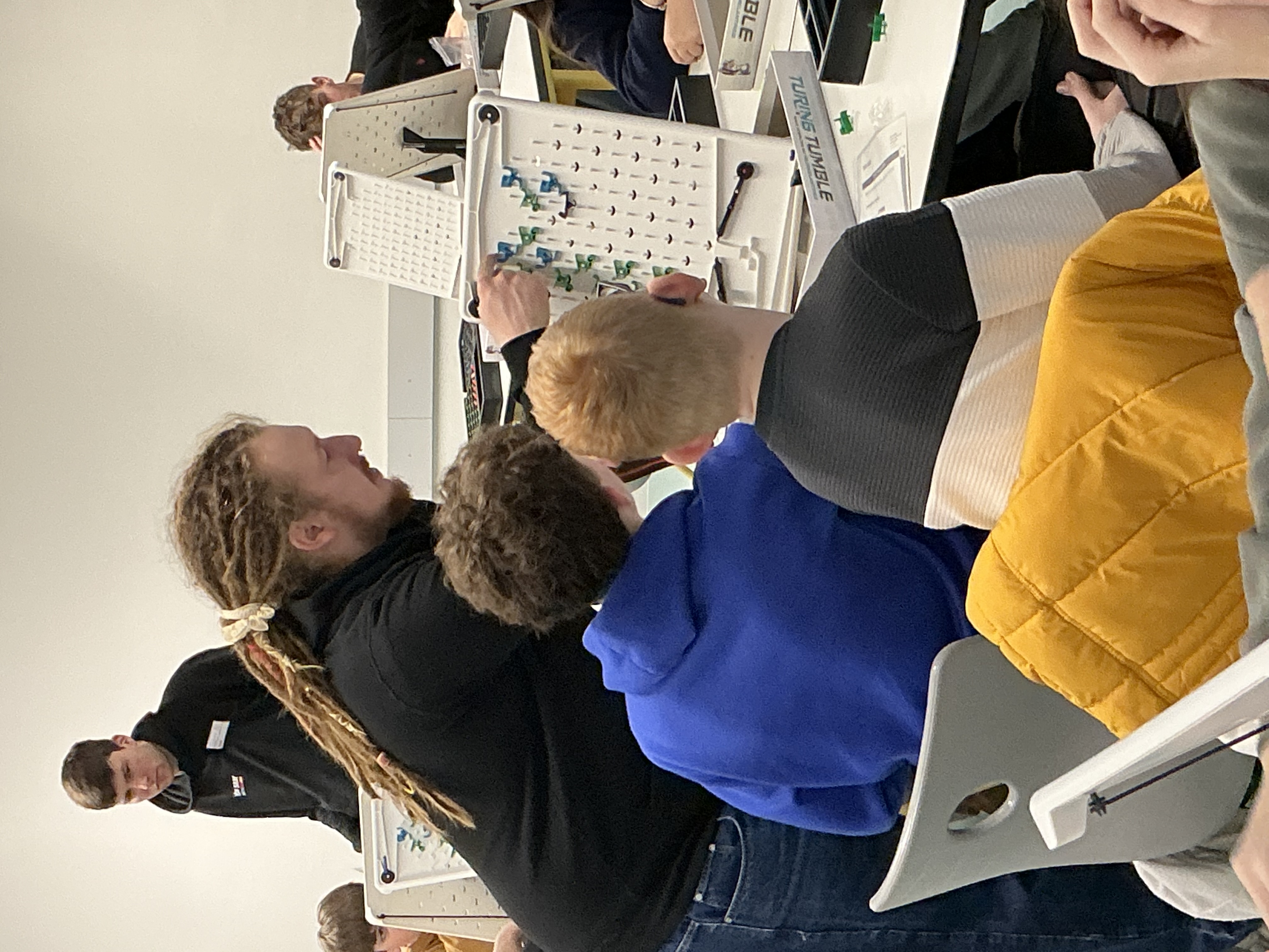 Als zentrales Element nutzten wir das Spiel Turing Tumble, hiermit werden mechanische Computer gebaut, bei denen fallende Kugeln anstelle von Code arbeiten. Zu Beginn erklärten wir mit Hilfe einer Präsentation die wichtigsten Bauteile des Spiels, wie Fallziele, Kreuzungen, Bits und Fänger. Diese wurden mit einfachen Beispielen erklärt, damit die Schüler*innen schnell verstehen konnten, wie die Kugeln durch das System laufen und wie man mit der Anordnung der Teile den Weg der Kugel steuern kann. Dabei ging es nicht um Fachbegriffe, sondern um das Prinzip: Was passiert, wenn ich hier etwas ändere? Wohin läuft die Kugel dann?
