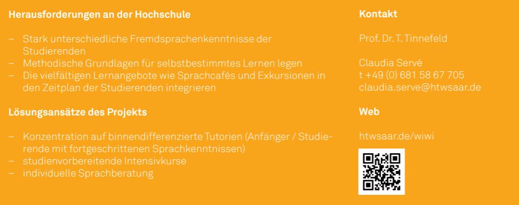 Doch der Erwerb der benötigten Qualifikationen ist für viele Studierende eine echte Herausforderung. Um die Studierenden der Studiengänge Internationale Betriebswirtschaftslehre und Internationales Tourismusmanagement bei dieser Herausforderung zu unterstützen, hat die htw saar zusätzlich zum Englischen auch Sprachlehrveranstaltungen für Französisch und Spanisch als zweite Fremdsprache eingerichtet. „Mit unserem seit 2012 bestehenden Projekt wollen wir zum einen die Studierenden mit Intensivkursen auf ein stabiles B1-Niveau in Französisch und Spanisch bringen, und zum anderen diejenigen mit fortgeschrittenen Sprachkenntnissen intensiv fachsprachlich fördern und sie zu einem abgeschlossenen B2-Niveau begleiten“, erklärt Projektmitarbeiterin Claudia Servé.