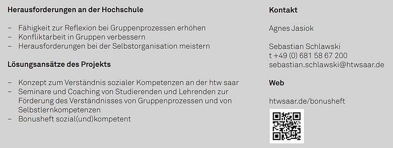 Persönliche und soziale Kompetenzen werden auch im Erproben und eigenen Erleben geschult. Über ein Bonusheft können Studierende seit dem Wintersemester 2016/17 für ihr ehrenamtliches Engagement an der Hochschule in Bonuspunkten erwerben. Haben die Studierenden genügend Bonuspunkte gesammelt, erhalten sie ein Hochschulzertifikat, das ihnen ihr Engagement bescheinigt. Damit wurde neben der Gratifizierung in Form von ECTS-Punkten oder einer Entlohnung eine weitere Möglichkeit geschaffen, studentische Leistungen anzuerkennen. Die Anerkennung des Engagements ist ein ideales Mittel, „um soziale Fähigkeiten immer mehr in den Fokus der Lehrarbeit zu rücken“, erklärt Agnes Jasiok. Dass die überfachlichen Schlüsselkompetenzen von Studierenden aller Fakultäten immer ernster genommen werden, bestätigten Agnes Jasiok die Feedbacks der Studierenden. „Selbst nach anfänglicher Skepsis von Einzelnen habe ich später immer eine positive Rückmeldung bekommen. Der Lerneffekt ist im sozialen Umgang eben schnell spürbar.“