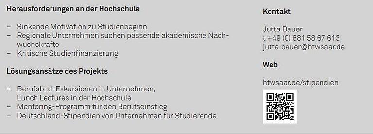 Die starke Praxisorientierung der Studienprogramme ist einer der wichtigsten Gründe, warum Studierende ihr Studium an der htw saar aufgenommen haben. Regionale Unternehmen auf der anderen Seite profitieren von den gut ausgebildeten Fachkräften, die passgenau vorbereitet in ihre neue Anstellung im Unternehmen starten.