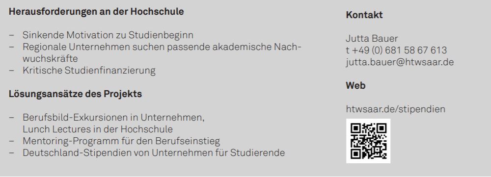 Die Referentin arbeitet vor allem sehr eng mit der StudienStiftungSaar bei der Bewerbung, Auswahl und Vergabe des Deutschland-Stipendiums zusammen. Die Arbeit hat sich gelohnt: Jährlich können mittlerweile alleine über 100 Deutschland-Stipendien vergeben werden. „Für die Unternehmen im Saarland ist die htw saar der wichtigste Partner für junge, gutausgebildete Talente“, sagt Bauer. Deswegen beteiligen sich die regionalen Arbeitgeber gerne am Deutschland-Stipendium der Hochschule. „Das jährliche Kennenlerntreffen zwischen Stipendiat*innen und Förderern in der IHK des Saarlandes ist eine großartige Gelegenheit, Kontakte zu knüpfen“, weiß die Profinetzwerkerin der htw saar: „Gute Partnerschaften erkennt man daran, dass beide Seiten gewinnen.“