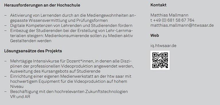 Früh rückte auch die Medienkompetenz der Studierenden in den Fokus. Studentische Gruppen wurden bei der Aufbereitung von Seminararbeiten oder Lerninhalten vom professionellen Filmteam der hbk saar unterstützt. Durch die Aufarbeitung für ein kompaktes Video setzten sich die studentischen Teams intensiv mit dem jeweiligen Thema auseinander. Studentische Aktivitäten wie die Flüchtlingsintegrationsinitiative wurden angeleitet, sich über das moderne Medium zu präsentieren. Lehrende setzen nun die Videoproduktion als aktivierende Methode in ihren Modulen ein. „Es gibt Lehrkräfte, die sich nun dafür einsetzen, Videoproduktion als Wahlfach zu integrieren!“